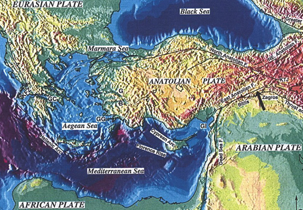 The Hellenic Arc - Three major tectonic plates, the Eurasia, Africa, and Arabia