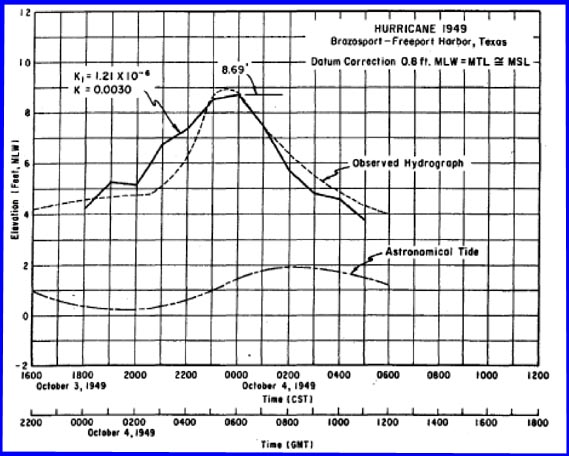 The storm system generated the following surges along the Texas coast: 11 feet at Velasco, 8 feet at Matagorda, 9 feet at Anahuac, and 11.4 feet at Harrisburg in the Houston Ship Channel (Zoch, 1949), and 10.5 feet at Greens Bayou.