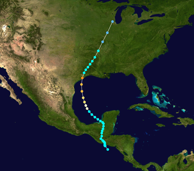 After landfall at Galveston, the storm system moved north through Texas and then into Oklahoma and Kansas. The remnants of the storm made it northeastward across the Great Lakes and into Canada before passing north of Halifax on Sept. 12 and disappearing into the North Atlantic.