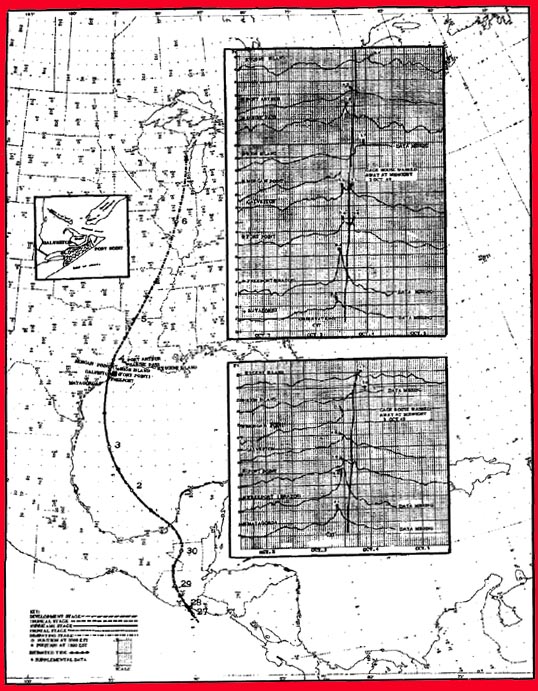 Track of the Hurricane of 3-4 October 1949. Storm surge (lower panel) and tide observations chart (hourly values only). Insert map for Galveston, Texas (source: Harris, 1963).
