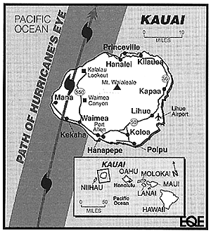 Iniki's path over Kauai is shown. Maximum winds were experienced