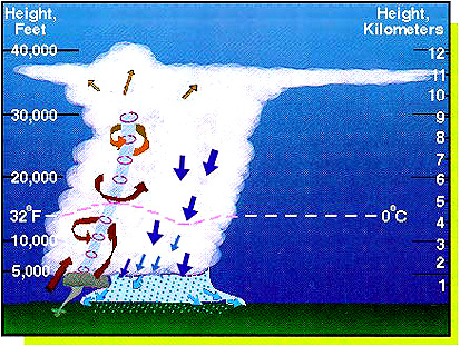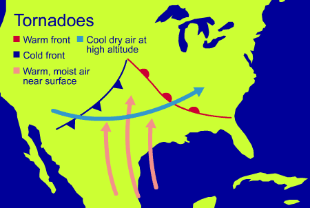 The interaction and collision of different air masses can result in thunderstorms. The largest and most violent of tornadoes are generated by the "super cell" thunderstorms, that are associated with strong winds, heavy rains and hail. Necessary for super cell thunderstorm formation and tornado generation, is warm, moist air close to the ground - being forced upward into colder, dry air at about 10,000 feet or higher in the atmosphere.Air Mass Interactions in Tornado Formation (graphic, U. K. Meteorological Office)