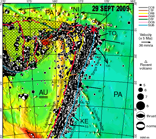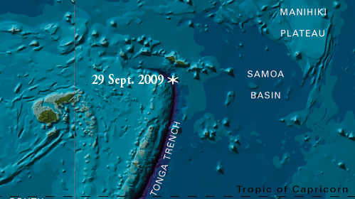 The September 29, 2009, occured near the seismically active northern end of the Tonga Trench and Arc where there is greater obliquity of collision and a sharp change in direction towards the west. This earthquake was particularly unusual in the sense that it did not occur on the inter-plate thrust fault within the subducting Pacific plate but further out on the outer-rise region. Outer-rise earthquakes are caused by extreme stresses that result in bending within the subducting oceanic plate itself before it enters the subduction zone.