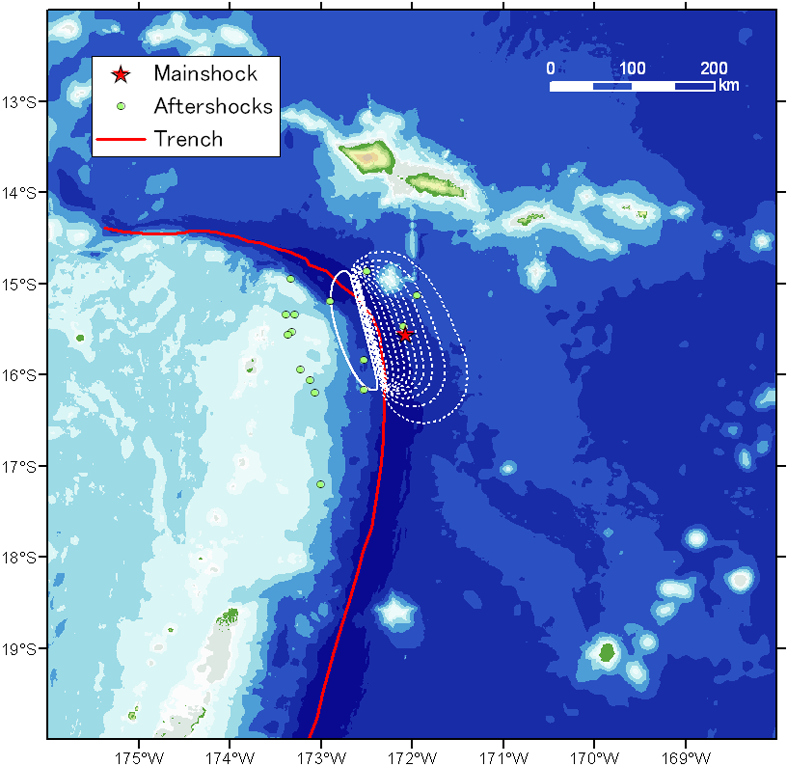 Rupture Length and Crustal Displacements - The distribution of afterschocks, the quake's magnitude and the focal mechanism analysis suggest that ruptures ranged by as much as 175 kilometres, along one or more normal faults on the outer-rise of the subducting Pacific plate.